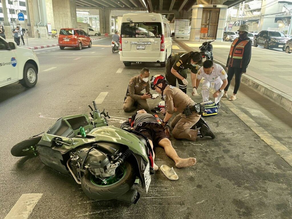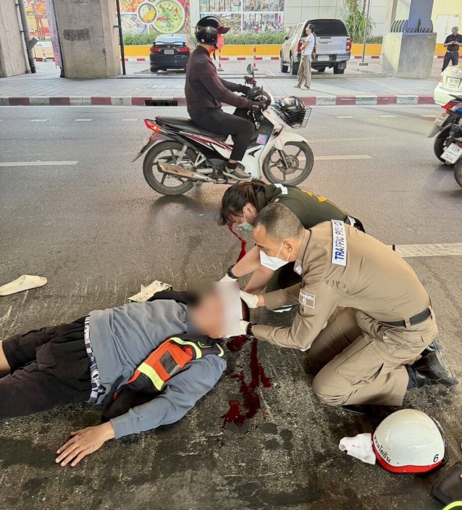 เจ้าหน้าที่จึงเข้าช่วยเหลือทันที ทำการกดบาดแผลห้ามเลือด ประคองศีรษะไม่ให้เคลื่อนไหว พร้อมประสานหน่วยกู้ภัย และจัดกำลังอำนวยการจราจรโดยรอบ เพื่อป้องกันอุบัติเหตุซ้ำซ้อนในช่วงชั่วโมงเร่งด่วน