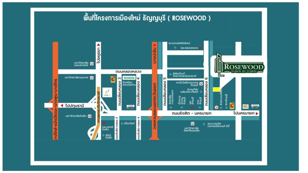 ทำเลศักยภาพสูง ใจกลางแหล่งการศึกษา การพัฒนาเมืองท่องเที่ยว และเมืองราชการ ROSEWOOD TOWN IN TOWN ตั้งอยู่ ตรงข้ามประตู 2 มหาวิทยาลัยเทคโนโลยีราชมงคล