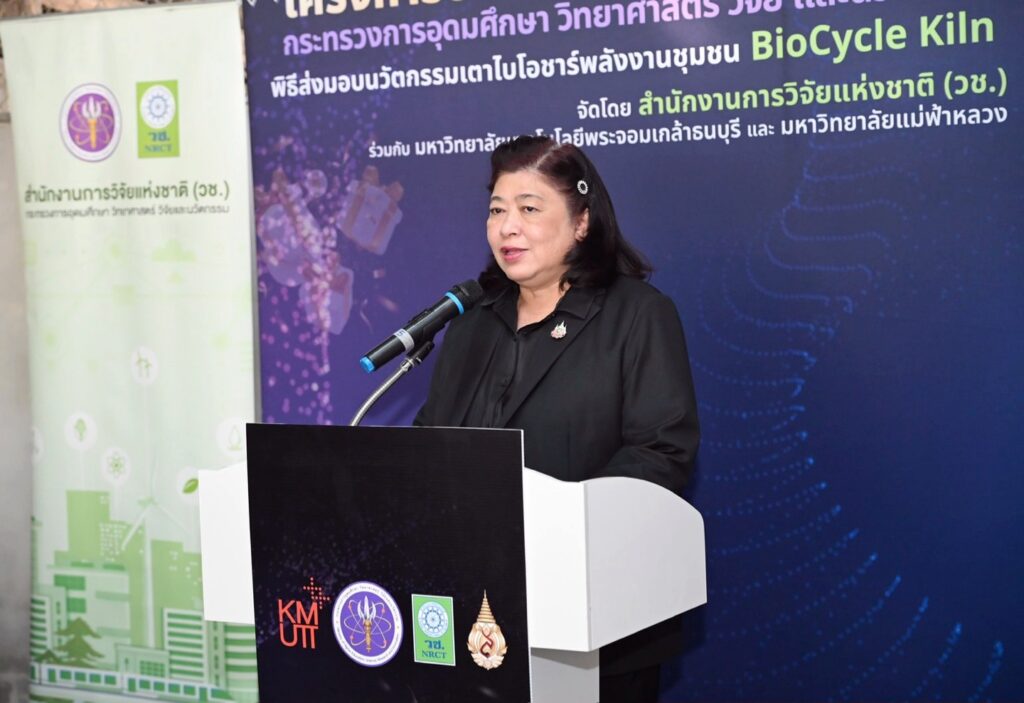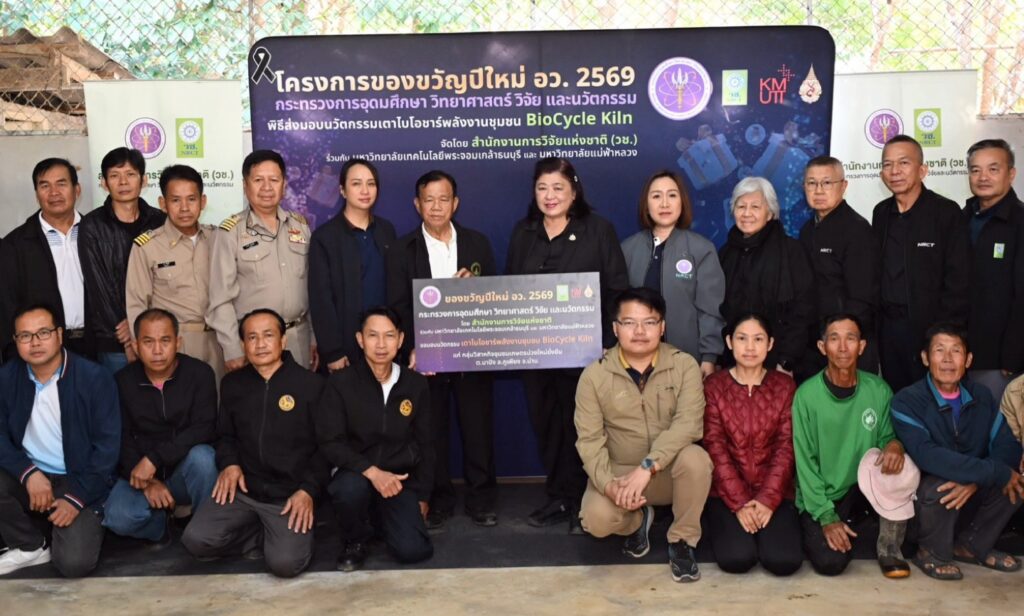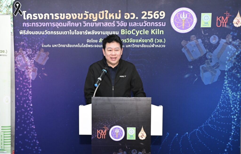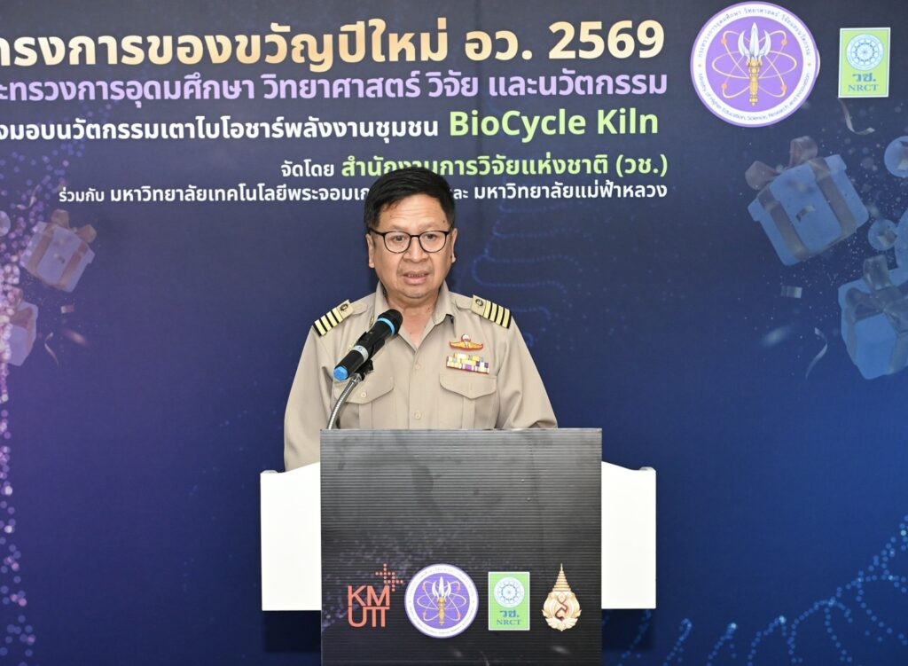 ดร.วิภารัตน์ ดีอ่อง ผู้อำนวยการสำนักงานการวิจัยแห่งชาติ (ผวช.) กล่าวว่า (อว.) ได้ดำเนินโครงการของขวัญปีใหม่ พ.ศ.2569 โดย (วช.) ร่วมขับเคลื่อนการนำนวัตกรรมไปใช้ประโยชน์ในระดับพื้นที่ ผ่านนวัตกรรมเตาไบโอชาร์พลังงานชุมชน BioCycle Kiln ซึ่งพัฒนาขึ้นจากความร่วมมือระหว่างมหาวิทยาลัยเทคโนโลยีพระจอมเกล้าธนบุรี และมหาวิทยาลัยแม่ฟ้าหลวง พร้อมทั้งถ่ายทอดองค์ความรู้ด้านการใช้งานให้แก่ชุมชนอย่างเป็นระบบ เพื่อให้สามารถนำเทคโนโลยีไปประยุกต์ใช้ในการจัดการเศษวัสดุเหลือทิ้งทางการเกษตรได้อย่างมีประสิทธิภาพ ช่วยลดปัญหามลพิษฝุ่นละอองขนาดเล็ก PM2.5 และส่งเสริมการพึ่งพาตนเองด้านเทคโนโลยีของชุมชน ตลอดจนต่อยอดการใช้ประโยชน์ในมิติทางเศรษฐกิจและสิ่งแวดล้อม อันจะนำไปสู่การยกระดับคุณภาพชีวิตของประชาชนและเสริมสร้างความเข้มแข็งให้กับชุมชน