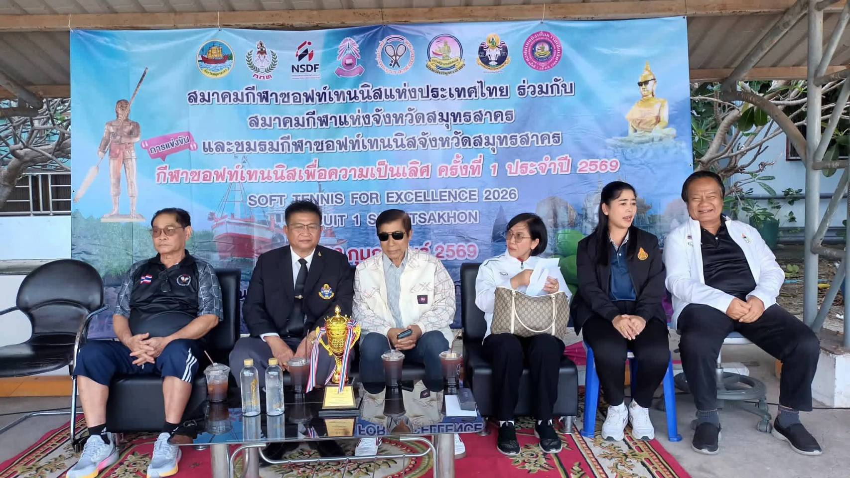วันที่ 21 ก.พ.2569 ที่ สนามเทนนิสมหาวิทยาลัยการกีฬาแห่งชาติ วิทยาเขตสมุทรสาคร สมาคมกีฬาซอฟท์เทนนิสแห่งประเทศไทย ร่วมกับ สมาคมกีฬาแห่งจังหวัดสมุทรสาคร และชมรมกีฬาซอฟท์เทนนิสจังหวัดสมุทรสาคร จัดการแข่งขันกีฬาซอฟท์เทนนิสเพื่อความเป็นเลิศ ครั้งที่ 1 ประจำปี 2569 SOFT TENNIS FOR EXCELLENCE 2026 CERCUIT 1 SAMUTSAKHON ระหว่างวันที่ 21-22 ก.พ.2569 โดยได้รับเกียรติจาก ดร.ปรัชญา สุภาพงศ์ รองอธิการบดีมหาวิทยาลัยการกีฬาแห่งชาติ วิทยาเขตสมุทรสาคร เป็นประธานในพิธีเปิดการแข่งขัน ร่วมด้วยนางอุดมลักษณ์ ศิริกุลเลิศรัฐ นายกสมาคมกีฬาซอฟท์เทนนิสแห่งประเทศไทย,นายบรรลือชัย ผิวสานต์ นายกกิตติมศักดิ์สมาคมกีฬาซอฟท์เทนนิสแห่งประเทศไทย,นายสุรศักดิ์ นาคนาคา เลขาธิการสมาคมกีฬาซอฟท์เทนนิสแห่งประเทศไทย,นายประเสริฐ อักษรทับ เลขาธิการสมาคมกีฬาแห่งจังหวัดสมุทรสาคร,นางสุภาพร นาคนาคา กรรมการบริหารสมาคมกีฬาซอฟท์เทนนิสฯ,ร.ต.อ.วิเชียร ชมบ้านแพ้ว ประธานชมรมซอฟท์เทนนิสจังหวัดสมุทรสาคร และ น.ส.เธียรฤทัย ทองใบอ่อน รอง ผอ.รร.วัดคลองครุ เข้าร่วมในพิธีพร้อมด้วยนักกีฬา กรรมการผู้ตัดสิน โดยมีวัตถุประสงค์เพื่อพัฒนาฝีมือนักกีฬาซอฟท์เทนนิสเพื่อความเป็นเลิศ และเก็บคะแนนสะสมเพื่อจัดอันดับแร้งกิ้งของสมาคมฯ โดยได้รับความสนใจจากนักกีฬาซอฟท์เทนนิสจากทั่วประเทศเข้าร่วมแข่งขันเป็นจำนวนมาก ในทุกรุ่นอายุการแข่งขันหลังพิธีเปิด นางอุดมลักษณ์ ศิริกุลเลิศรัฐ นายกสมาคมกีฬาซอฟท์เทนนิสแห่งประเทศไทย มอบไม้ซอฟท์เทนนิสและลูกให้กับชมรมซอฟท์เทนนิสซอฟท์เทนนิสจังหวัดสมุทรสาคร เพื่อต่อยอดพัฒนากีฬาซอฟท์เทนนิสจังหวัดสมุทรสาครต่อไป