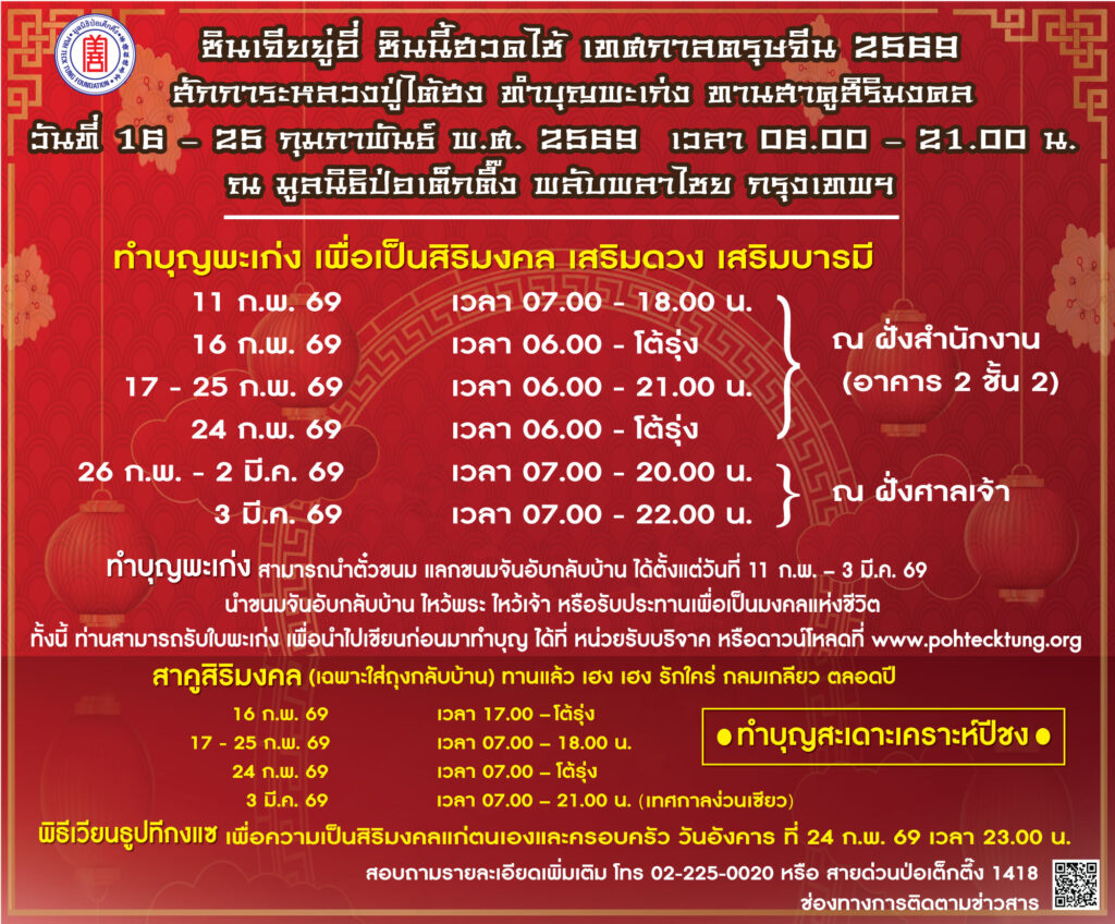 เทศกาลตรุษจีน มูลนิธิป่อเต็กตึ๊ง ประจำปี 2569 กำหนดจัดขึ้น ระหว่างวันที่ 16–25 กุมภาพันธ์ พ.ศ.2569 โดยขอเชิญชวนศิษยานุศิษย์ และสาธุชนทุกท่าน “สักการะหลวงปู่ไต้ฮง” ขอพรเนื่องในเทศกาลตรุษจีนเพื่อความเป็นสิริมงคลต้อนรับปีใหม่ ลงชื่อสวดชัยมงคลคาถา หรือ “พะเก่ง” เพื่อสะเดาะเคราะห์ ขอให้ครอบครัวมีสุข เสริมโชคลาภ เสริมดวงชะตา เสริมความมั่นคงสถาพร ตลอดปี รวมถึงทำบุญสะเดาะเคราะห์และเสริมความเป็นสิริมงคลกับรูปปั้นนักษัตรปีมะเมีย ซึ่งได้ผ่านการทำพิธีเบิกเนตรโดยพระอาจารย์จีนคณาณัติจีนพรต (เย็นงี้) เจ้าอาวาสวัดมังกรกมลาวาส (เล่งเน่ยยี่) พร้อมรับประทาน สาคูสิริมงคล เพื่อความกลมเกลียวและอยู่เย็นเป็นสุข รับฮู้ (ยันต์) ของหลวงปู่ไต้ฮง ติดหน้าบ้าน หรือพกติดตัวเพื่อคุ้มครอง เคาะระฆังทอง ให้ก้องกังวานเพื่อให้ชีวิตสดใส การงานรุ่งเรืองระบือไกล และร่วมขอพรเทพยดาฟ้าดินเนื่องในวันประสูติ (ทีกงแซ) ซึ่งในปีนี้ตรงกับวันอังคารที่ 24 กุมภาพันธ์ 2569 ขออำนาจฟ้าดินเป็นที่พึ่ง ขอให้สิ่งศักดิ์สิทธิ์ที่ตนนับถือ เช่น หลวงปู่ไต้ฮง ช่วยดลบันดาลให้ประสบโชคดีตลอดปีใหม่ (โดยในวันที่ 24 กุมภาพันธ์ 2569 มูลนิธิป่อเต็กตึ๊ง เปิดบริการโต้รุ่ง ให้แก่ผู้มีจิตศรัทธาได้เข้าสักการะ ทำบุญตลอดคืน)