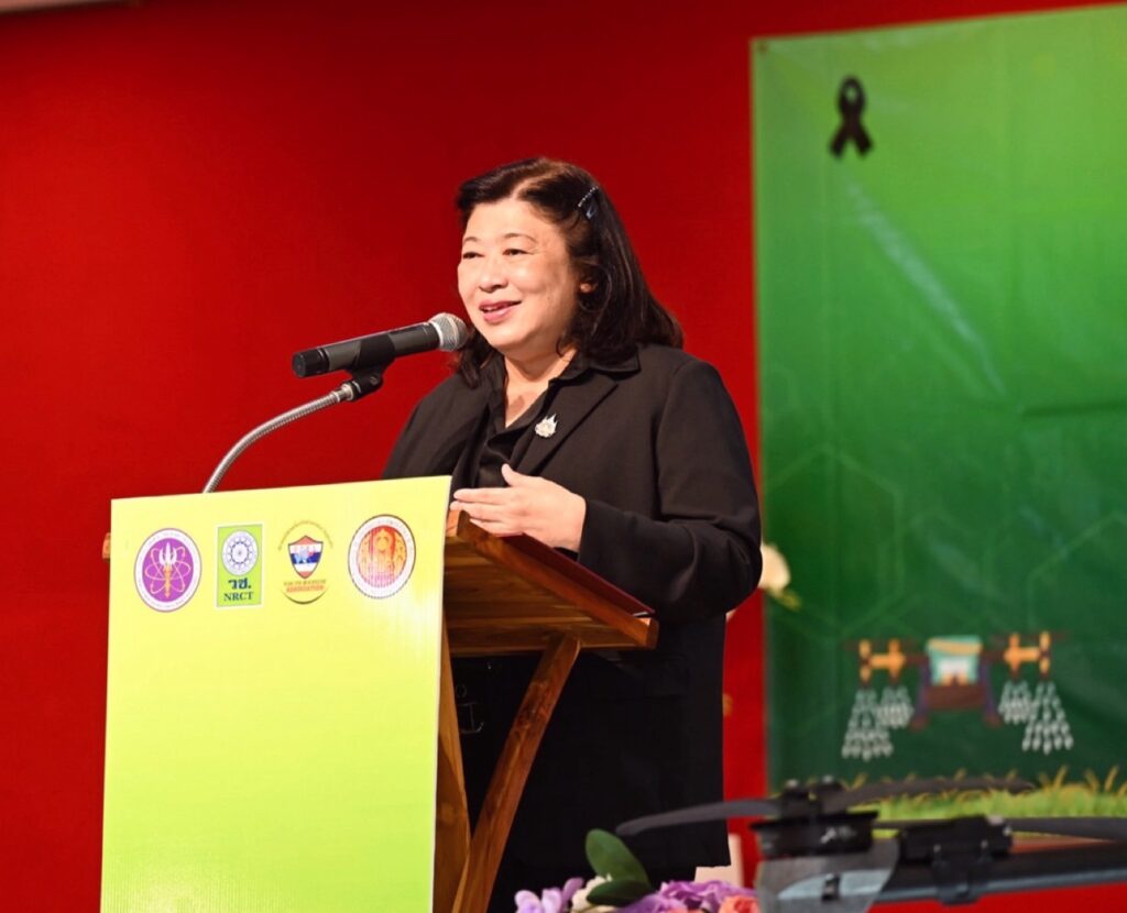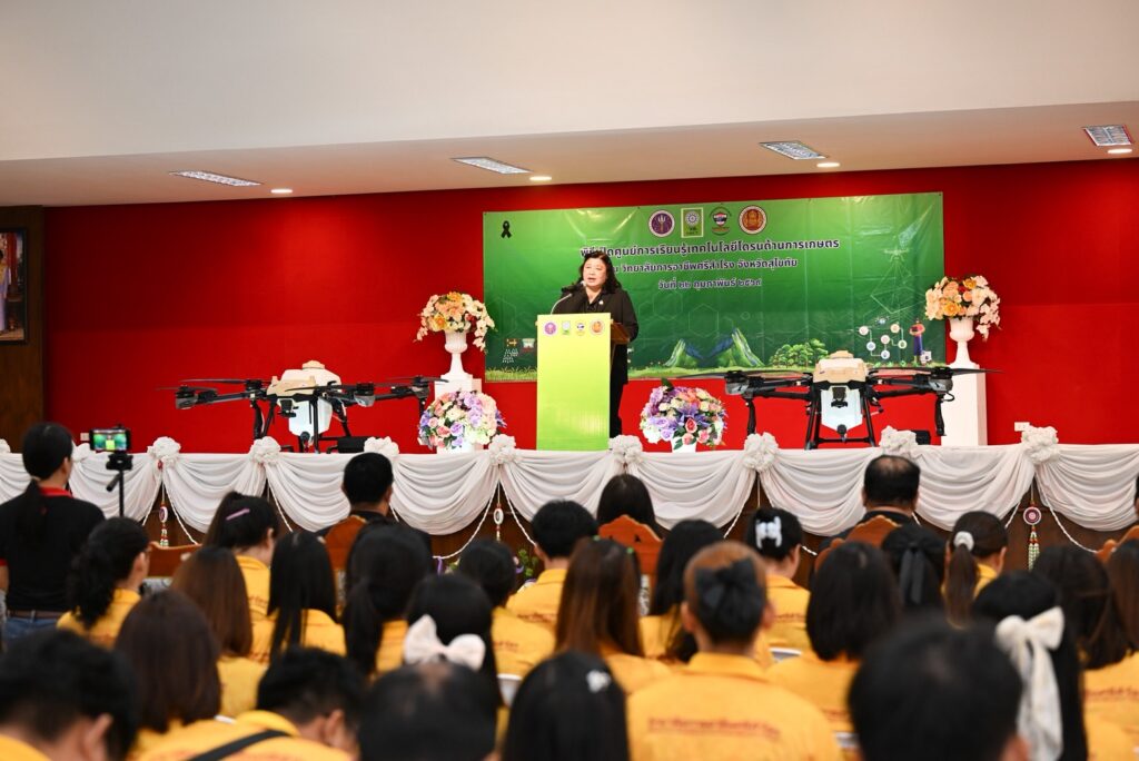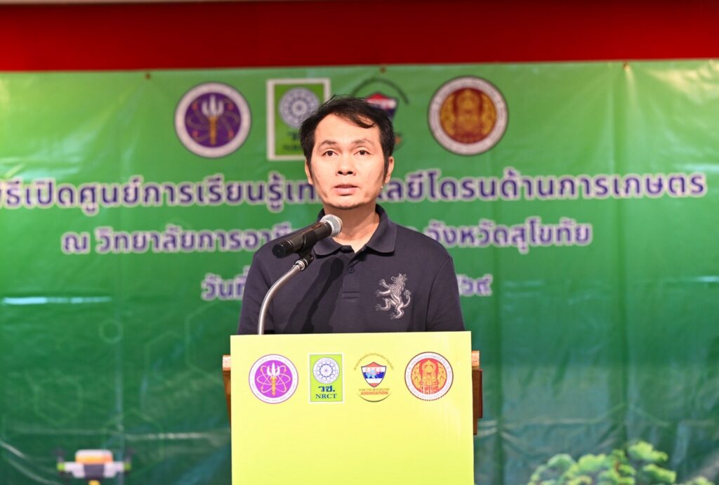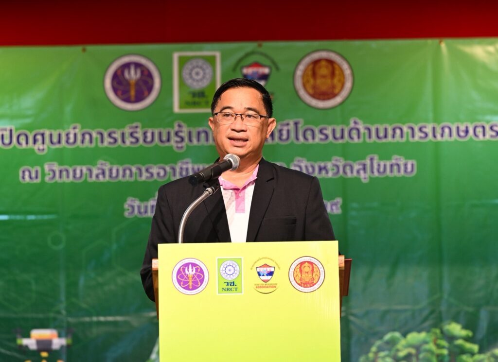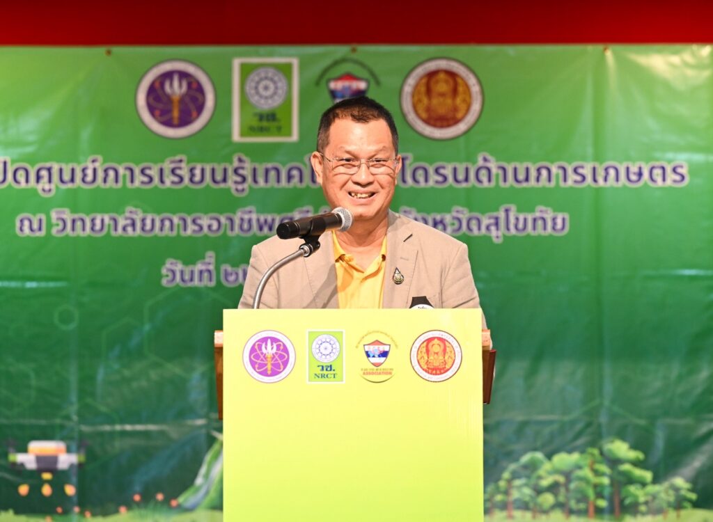 ดร.วิภารัตน์ ดีอ่อง ผู้อำนวยการสำนักงานการวิจัยแห่งชาติ (ผวช.) กล่าวว่า การจัดตั้งศูนย์การเรียนรู้เทคโนโลยีและนวัตกรรมโดรนเพื่อการเกษตร สะท้อนความมุ่งมั่นของ (วช.) ในการยกระดับการศึกษาอาชีวศึกษา ควบคู่กับการพัฒนาเทคโนโลยีและนวัตกรรมเพื่อรองรับการเปลี่ยนแปลงของภาคการเกษตรในยุคดิจิทัล เทคโนโลยีโดรนถือเป็นเครื่องมือสำคัญที่ช่วยเพิ่มประสิทธิภาพการผลิต ลดต้นทุน และเพิ่มความแม่นยำในการบริหารจัดการแปลงเกษตร โดยเฉพาะในจังหวัดสุโขทัยซึ่งมีศักยภาพด้านการเกษตรสูง สามารถประยุกต์ใช้โดรนในการสำรวจพื้นที่เพาะปลูก หว่านเมล็ด ให้ธาตุอาหารทางใบ และติดตามสุขภาพพืชผล ซึ่งจะช่วยยกระดับผลผลิต ลดต้นทุนแรงงาน และเสริมขีดความสามารถในการแข่งขันของสินค้าเกษตร