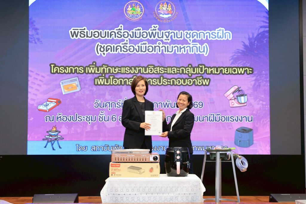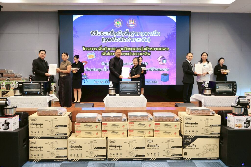 ด้านนายสมาสภ์ ปัทมะสุคนธ์ อธิบดีกรมพัฒนาฝีมือแรงงาน กล่าวเพิ่มเติมว่า สถาบันพัฒนาฝีมือแรงงาน 13 กรุงเทพมหานคร ได้รับจัดสรรเป้าหมายให้ดำเนินการโครงการเพิ่มทักษะแรงงานอิสระและกลุ่มเป้าหมายเฉพาะเพื่อเพิ่มโอกาสในการประกอบอาชีพ กิจกรรม พัฒนาทักษะแรงงานนอกระบบให้สอดคล้อง กับความสามารถเฉพาะบุคคลเพื่อการประกอบอาชีพ ประจำปีงบประมาณ พ.ศ.2569 เป้าหมาย 1,000 คน โดยเมื่อผ่านการอบรมแล้ว จะได้รับการสนับสนุนชุดเครื่องมือทำมาหากิน มูลค่า 4,000 บาทต่อคน เพื่อเป็นเครื่องมือในการสร้างโอกาสในการประกอบอาชีพ ซึ่งกรมพัฒนาฝีมือแรงงานได้จัดการฝึกอบรมไปแล้ว จำนวน 9 รุ่น รวม 180 คน ตั้งแต่เดือนพฤศจิกายน 2568 ถึง เดือน มกราคม 2569 โดยในวันนี้เป็นการมอบชุดเครื่องมือทำมาหากิน ให้แก่ผู้ผ่านการอบรม จำนวน 5 รุ่น รวมทั้งสิ้น 74 คน ในหลักสูตร การทำขนมเบเกอรี่มืออาชีพและหลักสูตร การประกอบอาหารสตรีทฟู้ด โดยชุดเครื่องมือที่มอบให้ ประกอบด้วย เตาอบไฟฟ้า เครื่องผสมอาหาร ชุดเตาแก๊สแรงดันสูงพร้อมอุปกรณ์ เตาปิ้งย่างแบบแก๊สพร้อมอุปกรณ์ หม้อทอดไร้น้ำมันไฟฟ้า ซึ่งผู้ผ่านการอบรมจะได้นำไปใช้ในการประกอบอาชีพต่อไป