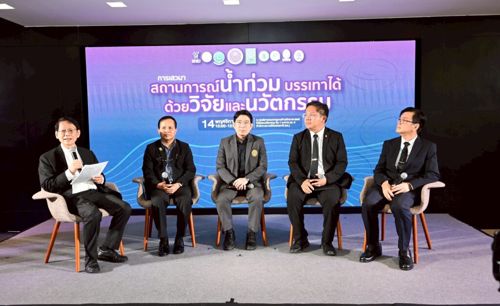 เมื่อวันที่ 14 พฤศจิกายน 2568 สำนักงานการวิจัยแห่งชาติ (วช.) กระทรวงการอุดมศึกษา วิทยาศาสตร์ วิจัยและนวัตกรรม (อว.) จัดการเสวนา “สถานการณ์น้ำท่วม บรรเทาได้ด้วยวิจัยและนวัตกรรม” โดยมี ดร.วิภารัตน์ ดีอ่อง ผู้อำนวยการสำนักงานการวิจัยแห่งชาติ (ผวช.) เป็นประธานเปิดการเสวนา พร้อมด้วยคณะวิทยากรผู้เชี่ยวชาญและนักวิจัย ร่วมกิจกรรมเสวนา ณ ศูนย์ข้อมูลสารสนเทศกลางด้านวิทยาศาสตร์ วิจัยและนวัตกรรมของประเทศ อาคาร วช.8 ดร.วิภารัตน์ ดีอ่อง ผู้อำนวยการสำนักงานการวิจัยแห่งชาติ (ผวช.) กล่าวว่า ผลกระทบจากพายุช่วงต้นเดือน พ.ย.2568 ทำให้ปริมาณน้ำในแม่น้ำสายหลักตอนบนเพิ่มสูงขึ้น ประกอบอ่างเก็บน้ำมีปริมาณน้ำกักเก็บจำนวนมากเพื่อเตรียมเปลี่ยนผ่านฤดู ทำให้มีความจำเป็นต้องเร่งระบายน้ำ โดยเฉพาะอย่างยิ่งบริเวณลุ่มเจ้าพระยา มีผลกับพื้นที่ภาคกลางตอนบนต้องเผชิญกับวิกฤตอุทกภัยในหลายจังหวัด อาทิ พระนครศรีอยุธยา อ่างทอง สิงหบุรี ชัยนาท (วช.) พร้อมด้วยทีมนักวิจัยและผู้เชี่ยวชาญ ร่วมกันสนับสนุนข้อมูลทางวิชาการ องค์ความรู้ เทคโนโลยี และนวัตกรรม เพื่อลดผลกระทบจากอุทกภัย บรรเทาความเดือนร้อนของประชาชน รวมทั้งการถอดบทเรียนจากสถานการณ์เพื่อเป็นแนวทางในการเฝ้าระวังภัยพิบัติ การเสวนา เรื่อง “สถานการณ์น้ำท่วม บรรเทาได้ด้วยวิจัยและนวัตกรรม” ได้รับเกียรติจาก รองศาสตราจารย์ ดร.สุจริต คูณธนกุลวงศ์ ผู้อำนวยการแผนงานเป้าหมายสำคัญตามยุทธศาสตร์ (ววน.) ประเด็นน้ำมั่นคง ไม่ท่วม ไม่แล้ง ของ (วช.) เป็นผู้ดำเนินการเสวนา พร้อมด้วยวิทยากรผู้เชี่ยวชาญจากหลากหลายหน่วยงานร่วมเสวนาใน 2 ช่วง ดังนี้ช่วงแรก : ระบบคาดการณ์และการประเมินสถานการณ์เพื่อการป้องกัน-นายสมควร ต้นจาน กรมอุตุนิยมวิทยา ให้ข้อมูลว่าปริมาณฝนทั้งประเทศในปีนี้มากกว่าค่าเฉลี่ยประมาณร้อยละ 9 แต่ยังน้อยกว่าปี 2554 แต่ปีนี้ฝนผิดปกติในช่วงต้นเดือน พ.ย.2568 ทั้งที่มีการประกาศเข้าฤดูหนาวแล้ว เกิดจากภาวะที่อากาศแปรปรวน ซึ่งคาดว่าจะเข้าสู่ฤดูหนาวในช่วงวันที่ 14 พ.ย.2568 แต่ภาคใต้จะมีฝนตกเพิ่มขึ้น โดยเฉพาะจังหวัดนราธิวาส ปัตตานี และยะลา-ผู้ช่วยศาสตราจารย์ ดร.ไชยาพงษ์ เทพประสิทธิ์ มหาวิทยาลัยเกษตรศาสตร์ สรุปสถานการณ์และแนวโน้มน้ำท่า โดยสังเขปว่า ปีนี้น้ำเหนือเขื่อนและใต้เขื่อนมีมากตั้งแต่ช่วงพายุบัวลอย ฝนที่ตกเพิ่มในระยะสั้นช่วงต้นเดือน พ.ย. มีปริมาณมาก ทำให้เขื่อนตอนบนมีปริมาณน้ำไหลลงจนเต็มความจุ จนส่งผลต่อปริมาณน้ำในบริเวณลุ่มน้ำเจ้าพระยาตอนบน และยังตรงกับช่วงน้ำทะเลหนุนทำให้การระบาย