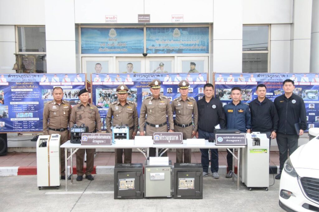 วันที่ 13 พ.ย.2568 เวลา 11.00 น. ณ หน้าลาน สภ.คูคต จ.ปทุมธานึ : พล.ต.ท.วัฒนา ยี่จีน ผบช.ภ.1 พร้อมด้วย พล.ต.ต.วิชิต บุญชินวุฒิกุล รอง ผบช.ภ.1,พล.ต.ต.พีรพล โชติกเสถียรผบก.ภ.จ.ปทุมธานี พร้อมข้าราชการตำรวจที่เกี่ยวข้อง ร่วมแถลงข่าวผลการจับกุมปฏิบัติการกวาดล้างเว็บพนันออนไลน์ และ ปราบสแกมเมอร์ 2 คดีคีอ 1.ร่วมกันกันจัดให้มีการเล่นหรือทำอุบายล่อฯ และร่วมกันฟอกเงิน” พร้อมด้วยของกลาง เงินสด จำนวน 30,324,600 บาท บัตรเอทีเอ็ม (บัญชีม้า) ประมาณ 100 ใบ,โทรศัพท์มือถือ 22 เครื่อง,เอกสารการโอนเงินใบเสร็จค่าน้ำไฟหลายรายการระหว่างตรวจนับและทำการตรวจยึดอายัดทรัพย์ตาม พ.ร.บ.ป้องกันและปราบปรามการฟอกเงินยอดรวม 20 ล้านบาท 2.จับกุมผู้ที่กระทำความผิดเกี่ยวกับสแกมเมอร์ได้จำนวน 7 คอกม้า ตรวจยึดเงินสดของกลาง จำนวน 5,580,300 บาท และคืนเงินผู้เสียหายไปจำนวน 8 ราย เป็นเงินจำนวน 1,200,000 บาท
