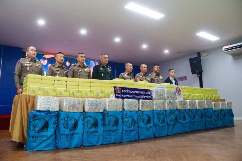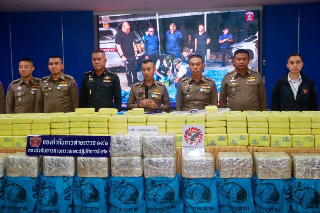 เมื่อวันพุธที่ 12 พ.ย.2568 เวลา 13.00 น. ณ อาคารศึกษาฝึกอบรม บก.สปพ. : พล.ต.อ.สำราญ นวลมา รอง ผบ.ตร. พร้อมด้วยพล.ต.ท.สยาม บุญสม ผบช.น.,พล.ต.ต.ธีรเดช ธรรมสุธีร์ รอง ผบช.น.,พล.ต.ต.วรวิทย์ ญาณจินดา ผบก.สปพ.,พ.ต.อ.วสันต์ ธวัชชัยวิรุตษ์ ผกก.สายตรวจ,พ.ต.ท.วสุเทพ ใจอินทร์ รอง ผกก.สายตรวจ,พ.อ.วิรุฬห์ ชัยสุวิรัตน์ หน่วยข่าวกรองทางทหาร กองทัพบก ร่วมแถลงผลการจับกุมของกองบังคับการตำรวจสายตรวจปฏิบัติการพิเศษ หรือ 191 จับกุมผู้ต้องหา จำนวน 2 รายคือ 1.น.ส.เมรินทร์ฯ สงวนนามสกุล อายุ 33 ปี ผู้ต้องหาที่ 1 และ 2.น.ส.ศิริรัตน์ฯ สงวนนามสกุล อายุ 33 ปี ผู้ต้องหาที่ 2 โดยกล่าวหาผู้ต้องหาว่า “ร่วมกันกับพวกที่หลบหนีจำหน่ายยาเสพติดให้โทษในประเภท 1 (ยาบ้าหรือเมทแอมเฟตามีน) โดยมีไว้ในครอบครองเพื่อจำหน่ายโดยไม่ได้รับอนุญาต อันเป็นการกระทำเพื่อการค้า และก่อให้เกิดการแพร่กระจายในกลุ่มประชาชนทำให้เกิดผลกระทบต่อความมั่นคงของรัฐหรือความปลอดภัยของประชาชนทั่วไป” พร้อมด้วยของกลางและทรัพย์ที่ตรวจยึด 1.ยาบ้า ประมาณ 50 กระสอบ รวม ยาบ้าประมาณ 10 ล้านเม็ด,2.รถยนต์ ยี่ห้อ Toyota รุ่น vios สีขาว จำนวน 1 คัน,3.รถยนต์ ยี่ห้อ Chevrolet รุ่น Colorado สีขาว จำนวน 1 คัน,4.รถยนต์ ยี่ห้อ Toyota รุ่น Fortuner สีดำ จำนวน 1 คัน และ 5.รถจักรยานยนต์ จำนวน 1 คัน มูลค่ารวมประมาณ 500,000,000 บาท