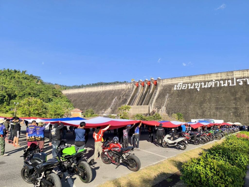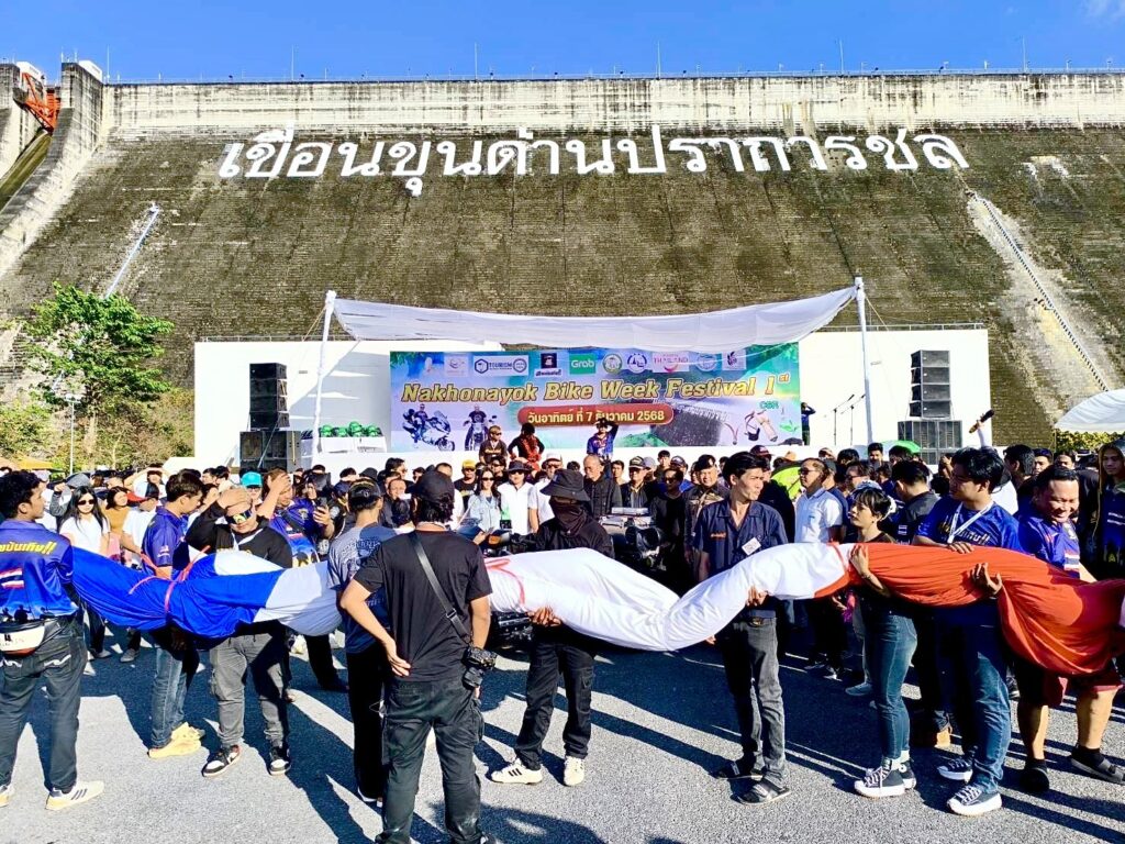 นครนายก — วันที่ 7 ธ.ค. 2568 บรรยากาศที่ ลานกิจกรรมเขื่อนของพ่อ โครงการส่งน้ำและบำรุงรักษาเขื่อนขุนด่านปราการชล ต.หินตั้ง อ.เมือง เต็มไปด้วยนักท่องเที่ยวและชาวบิ๊กไบค์กว่า 700 คน ร่วมกิจกรรม แปรอักษรอัญเชิญธงชาติไทยผืนใหญ่ยาว 100 เมตร กว้าง 20 เมตร สุดอลังการ