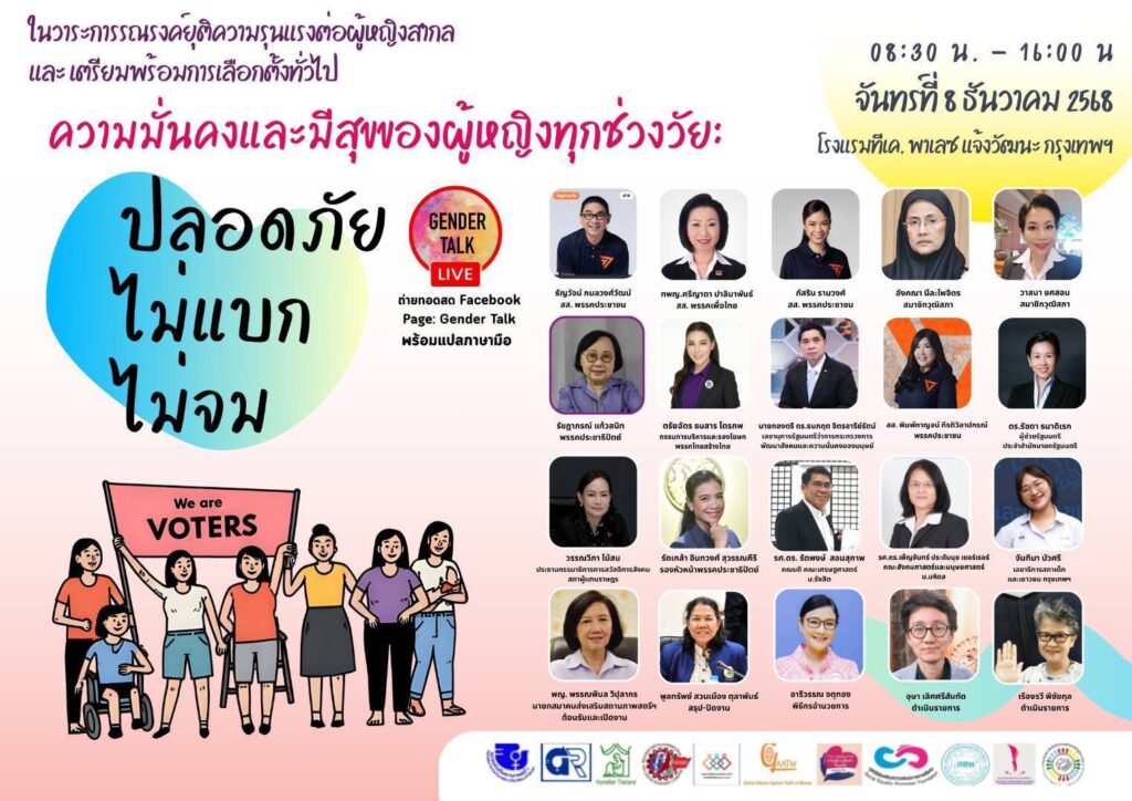 วันที่ 8 ธ.ค. ที่โรงแรมทีเค พาเลซ เครือข่ายองค์กรผู้หญิง ภาคเอกชน และตัวแทนพรรคการเมือง เปิดเวทีเสวนานโยบายสาธารณะ “ความมั่นคงและมีสุขของผู้หญิงทุกช่วงวัย : ปลอดภัย ไม่แบก ไม่จม” ย้ำปัญหาความรุนแรงต่อเด็ก–สตรีพุ่งเฉลี่ยวันละ 42 ราย เศรษฐกิจ–ภัยสงคราม–ออนไลน์ซ้ำเติมชีวิตผู้หญิง พร้อมเตรียมข้อเสนอต่อรัฐบาลใหม่