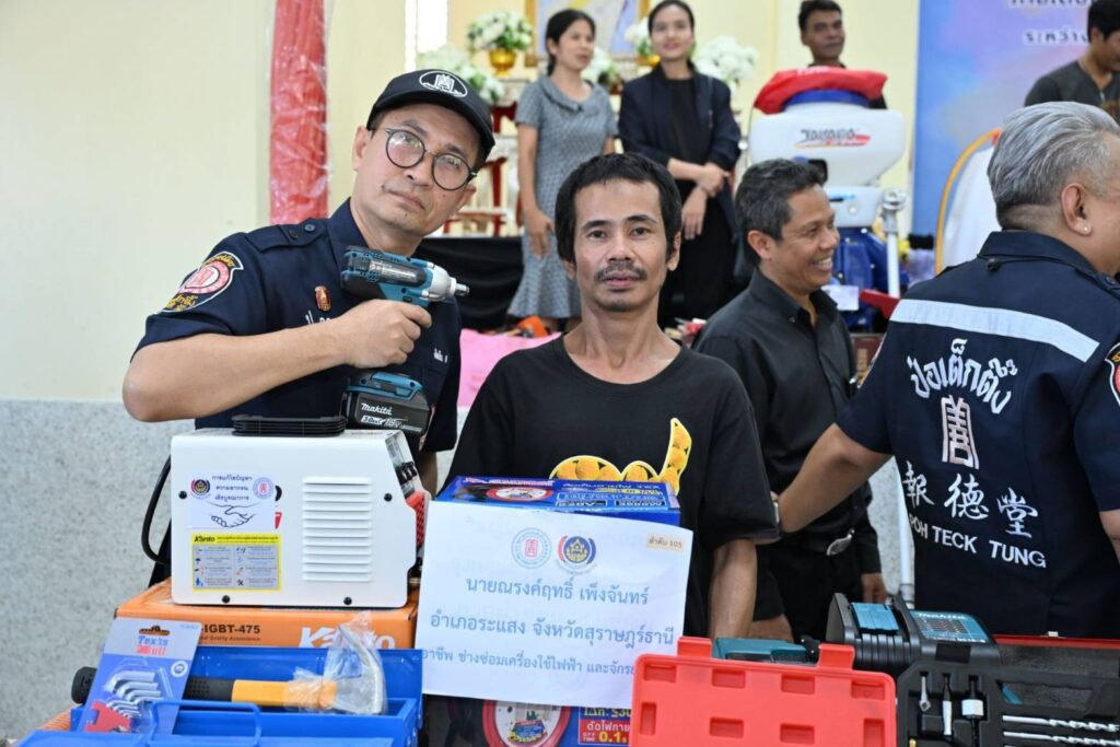 เมื่อวันศุกร์ที่ 19 ธันวาคม พ.ศ.2568 : มูลนิธิป่อเต็กตึ๊ง นำโดย นายสุรพงษ์ เตชะหรูวิจิตร กรรมการและรองเลขาธิการฯ พร้อมด้วย นายสุรพงศ์ เสรฐภักดี กรรมการและรองเหรัญญิกฯ,นางสาวศุภรัตน์ สมบัติเจริญไทย หัวหน้าแผนกส่งเสริมการศึกษาและอาชีพฯ และนางสาวเนาวรัตน์ วรรณศิริ หัวหน้าแผนกหน่วยแพทย์สงเคราะห์ชุมชนฯ นำทีมลงพื้นที่มอบอุปกรณ์ประกอบอาชีพให้แก่ครัวเรือนยากจน ในพื้นที่จังหวัดสุราษฎร์ธานี (จังหวัดที่ 3 ของทางภาคใต้) จำนวน 28 ครัวเรือน มูลค่าทั้งสิ้น 690,450 บาท (หกแสนเก้าหมื่นสี่ร้อยห้าสิบบาทถ้วน) พร้อมจัดหน่วยแพทย์สงเคราะห์ชุมชนฯ นำทีมแพทย์อาสาฯ เจ้าหน้าที่หน่วยแพทย์ ทีมบรรเทาสาธารณภัย (กู้ชีพ) และอาสาสมัครลงพื้นที่ให้บริการประชาชนฟรี ประกอบด้วย บริการตรวจรักษาโรคทั่วไป จ่ายยา ทันตกรรม คัดกรองเบาหวาน ตรวจวัดสายตาพร้อมแจกแว่น บริการตัดผมชาย-หญิง และกิจกรรมนันทนาการ โดยมี นายจุมพฏ วรรณฉัตรสิริ ผู้ว่าราชการจังหวัดสุราษฎร์ธานี และนายสงัด พืชพันธุ์ หัวหน้าผู้ตรวจราชการกรมการพัฒนาชุมชน เป็นประธานร่วมในพิธี คณะมูลนิธิกุศลศรัทธาสุราษฎร์ธานีเป็นผู้ประสานงานและร่วมในพิธี พร้อมด้วย อาสาสมัครศิลปินมูลนิธิป่อเต็กตึ๊ง นำโดย นายนพดล ทรงแสง (จิ้ม ชวนชื่น),นายธวัชชัย คชาอนันต์ (แฮ็ค ชวนชื่น) และ นายเกียรติภูมิ บันลือชัยฤทธิ์ (ภูมิ) ร่วมในพิธี ณ บริเวณหอประชุมที่ว่าการอำเภอท่าฉาง จังหวัดสุราษฎร์ธานี